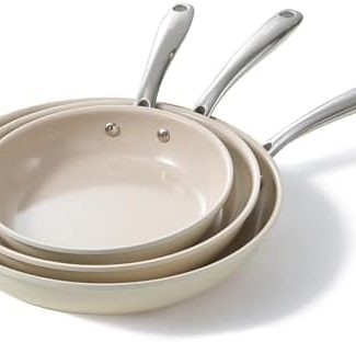 Redchef Nonstick Frying Pans Set, Ceramic Pan Skillet, Non Toxic Pans for Cooking, 8″ 9.5″ 11″ Ceramic Frying Pan Set PFAS & PTFE & PFOA Free with Stay Cool Handle, Dishwasher & Oven Safe, Beige White