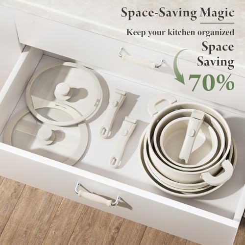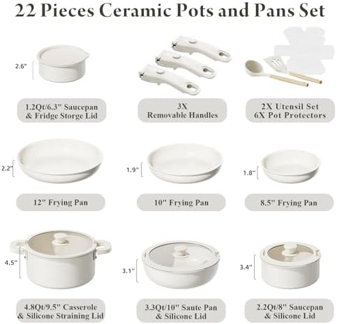 22-Piece Pots and Pans Set Non Stick with Removable Handles, Ceramic Cookware Set, Large-Capacity & Non Toxic, Induction & RV Compatible, Dishwasher Safe, PFAS/PTFE/PFOA Free, White