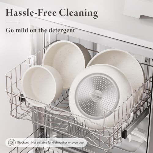 Safety is our priority; this cookware set is PFAS, PTFE, and PFOA free, ensuring that no harmful chemicals leach into your food. Enjoy peace of mind while cooking delicious meals for your loved ones. Cleaning up is a breeze as all pieces are dishwasher safe, saving you time and effort.